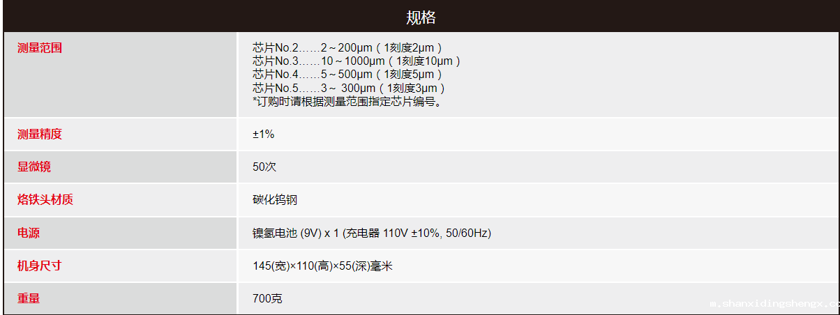 电机将纸张切割成蛇形,大大提高了可读性。符合 ISO2808、ASTM D4138、DIN 50 986测量范围芯片No.2……2~200μm(1刻度2μm)芯片No.3……10~1000μm(1刻度10μm)芯片No.4……5~500μm(1刻度5μm)芯片No.5……3~ 300μm(1刻度3μm)订购时请根据测量范围芯片编号。测量精度±1%显微镜50次烙铁头材质碳化钨钢电源镍氢电池 (9V) x 1 (充电器 110V ±10%, 50/60Hz)机身尺寸145(宽)×110(高)×55(深)毫米重量700克