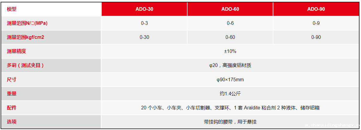模型ADO-30ADO-60ADO-90测量范围N/㎟(MPa)0-30-60-9测量范围kgf/cm20-300-600-90测量精度±10%多莉(测试夹具)φ20,高强度铝材质尺寸φ90×175mm重量约1.4公斤配件20 个小车、小车夹、小车切割器、支撑环、1 套 Araldite 粘合剂 2 种液体、储存铝箱