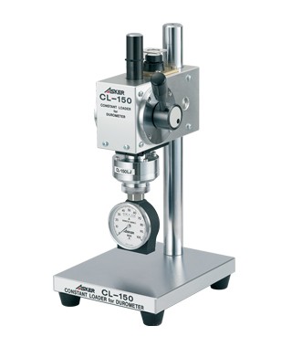 当使用橡胶硬度计(硬度计)手动测量橡胶样品的硬度时,存在测量结果变化的问题。CL-150 系列是恒压/恒速负载容器,可消除这种变化。此外,采用柔性接头可确保硬度计压力面和样品测量面之间的紧密接触,从而实现且高再现性的硬度测量。另外,通过更换砝码,可以对应需要不同测量压力的各种硬度计。