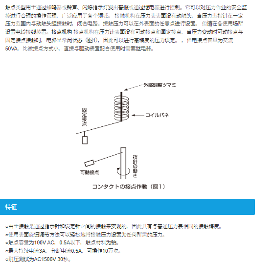 由于接触是通过指示针和设定针之间的接触来实现的,因此具有与普通压力表相同的接触精度。使用表面旋钮调节方法可以轻松地将接触压力设置为任何所需的压力。触点容量为100V AC,0.5A以下,触点材料为铂。持续电流3A,分断电流0.5A,可操作10万次。耐压测试为AC1500V 30秒。