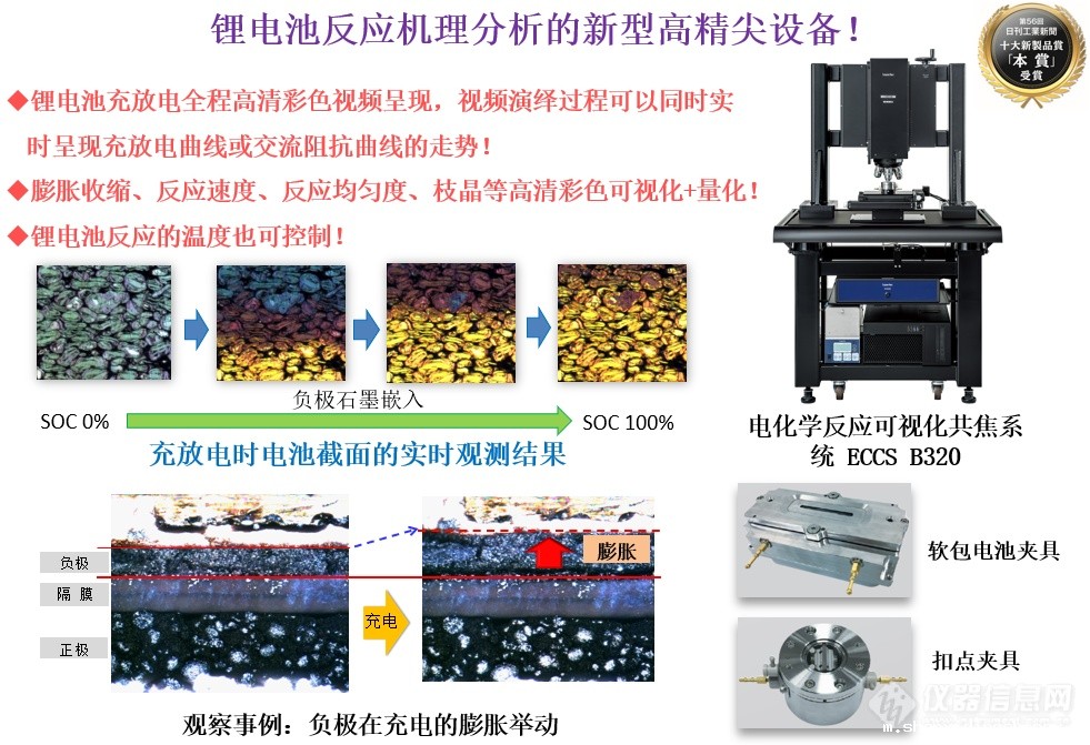 产品简介: 锂电池反应机理分析的新型高精尖访 锂电池充放电全程高清彩色视频呈现,视频演绎过程可以同时实时呈现充放电曲线或交流阻抗曲线的走势! 膨胀收缩、反应速度、反应均匀度、枝晶等高清彩色可视化+量化!锂电池反应的温度也可控制!