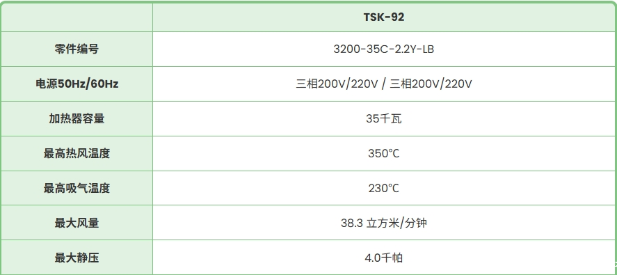 产品简介: TSK-92 零件编号 3200-35C-2.2Y-LB 电源50Hz/60Hz 三相200V/220V / 三相200V/220V 加热器容量 35千瓦 最高热风温度 350℃ 最高吸气温度 230℃ 最大风量 38.3 立方米/分钟 最大静压 4.0千帕
