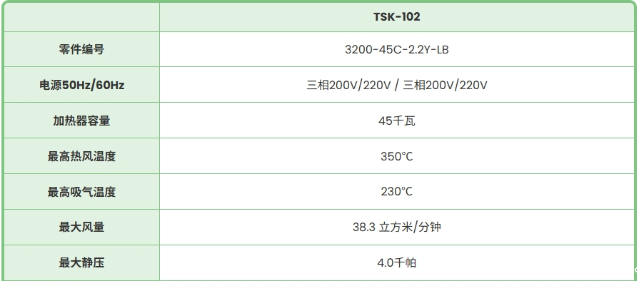 产品简介: TSK-102 零件编号 3200-45C-2.2Y-LB 电源50Hz/60Hz 三相200V/220V / 三相200V/220V 加热器容量 45千瓦 最高热风温度 350℃ 最高吸气温度 230℃ 最大风量 38.3 立方米/分钟 最大静压 4.0千帕