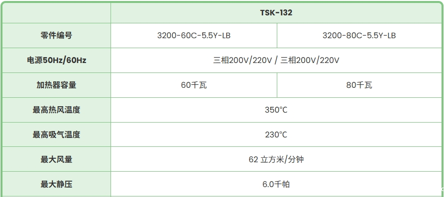 产品简介: TSK-132 零件编号 3200-60C-5.5Y-LB 3200-80C-5.5Y-LB 电源50Hz/60Hz 三相200V/220V / 三相200V/220V 加热器容量 60千瓦 80千瓦 最高热风温度 350℃ 最高吸气温度 230℃ 最大风量 62 立方米/分钟 最大静压 6.0千帕