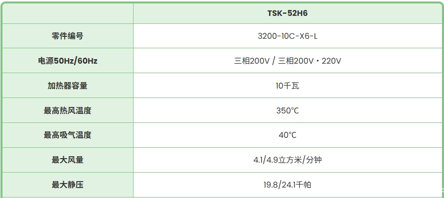 产品简介: TSK-52H6 零件编号 3200-10C-X6-L 电源50Hz/60Hz 三相200V / 三相200V・220V 加热器容量 10千瓦 最高热风温度 350℃ 最高吸气温度 40℃ 最大风量 4.1/4.9立方米/分钟 最大静压 19.8/24.1千帕