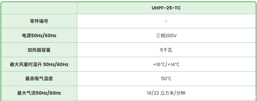 产品简介: UHPF-25-TC 电源50Hz/60Hz 三相200V 加热器容量 5千瓦 最大风量时温升 50Hz/60Hz +16℃/+14℃ 最高吸气温度 50℃ 最大气流50Hz/60Hz 19/22 立方米/分钟