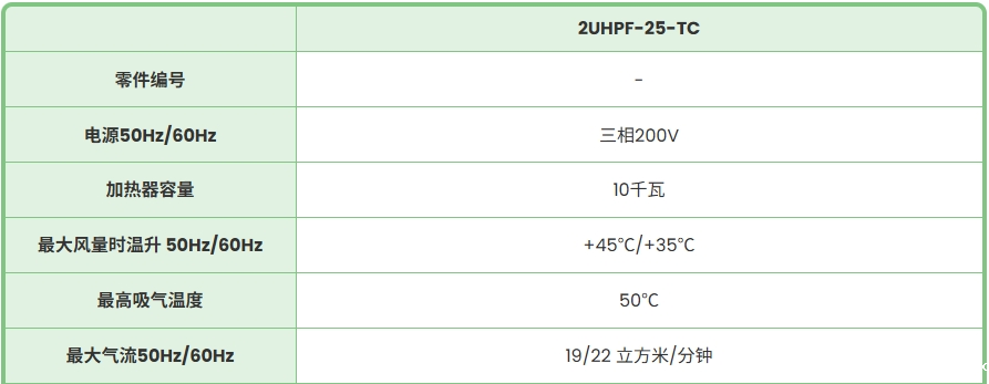 产品简介: 2UHPF-25-TC 电源50Hz/60Hz 三相200V 加热器容量 10千瓦 最大风量时温升 50Hz/60Hz +45℃/+35℃ 最高吸气温度 50℃ 最大气流50Hz/60Hz 19/22 立方米/分钟